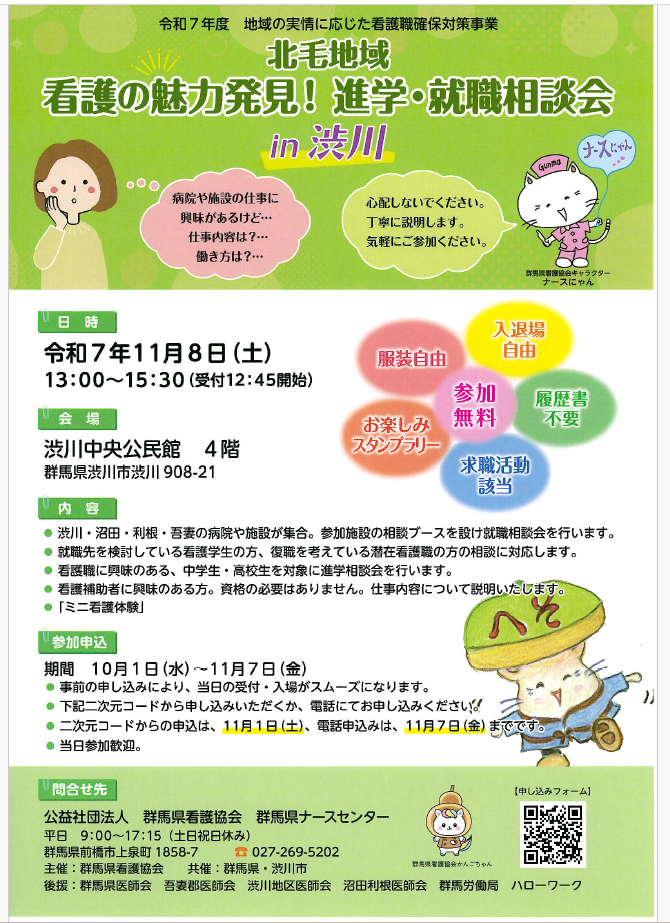 沼田准看護学校は、令和7年11月8日(土)に渋川で行われる「北毛地域 看護の魅力発見!進学・就職相談会 in渋川」に参加します。当日は、学校の説明や入学試験についてお話ししようと思っています。看護に興味・関心のある方や看護学校に入学を考えている方、ぜひぜひお越し下さい。お待ちしております。